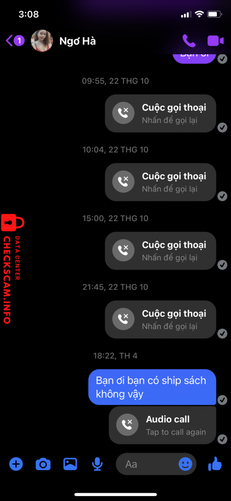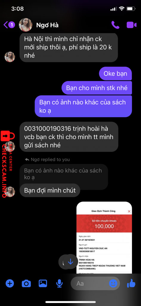 Scammer Alert: Trịnh Hoài Hà Reported: November 16, 2024 Scammer Information Full Name: Trịnh Hoài Hà Payment Gate: Vietcombank Payment Account: 0031000190316 Category: Marketplace scams Source: Checkscam Evidence Files Report Description Lừa mình mua sách cũ, mình đã ck nhưng không chuyển hàng. Block Fb mình Comments Your comment Add Comment No comments yet. Be the first to share your experience with this scammer.