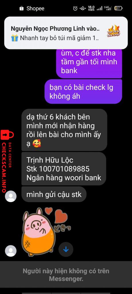 Scammer Alert: Trịnh Hữu Lộc Reported: November 16, 2024 Scammer Information Full Name: Trịnh Hữu Lộc Payment Gate: woori bank Payment Account: 100701089885 Category: Marketplace scams Source: Checkscam Evidence Files Report Description Buôn bán lừa đảo Comments Your comment Add Comment No comments yet. Be the first to share your experience with this scammer.