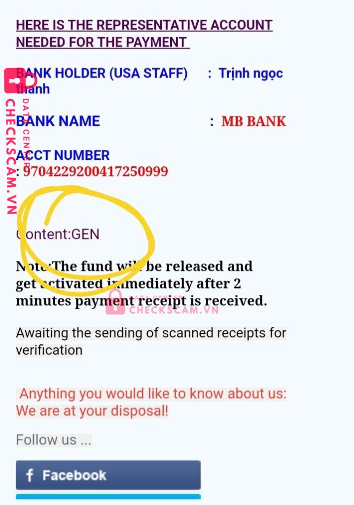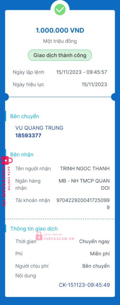 Scammer Alert: Trịnh ngọc thanh Reported: November 16, 2024 Scammer Information Full Name: Trịnh ngọc thanh Payment Gate: mb bank Payment Account: 9704229200417250999 Category: Marketplace scams Source: Checkscam Evidence Files Report Description lừa đảo mua bán qua mang ..giả la người nước ngoài Comments Your comment Add Comment No comments yet. Be the first to share your experience with this scammer.