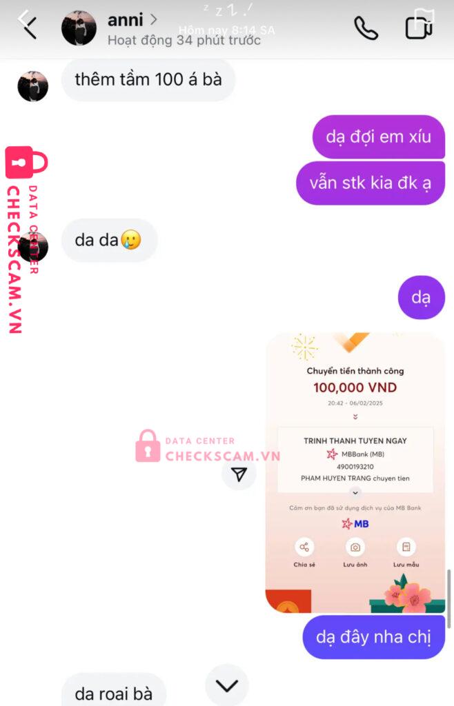 Scammer Alert: Trinh Thanh Tuyen Ngay Reported: March 7, 2025 Scammer Information Full Name: Trinh Thanh Tuyen Ngay Payment Gate: mb bank Payment Account: 4900193210 Category: Marketplace scams Source: Checkscam Evidence Files Report Description scam săn iphone 50k Comments Your comment Add Comment No comments yet. Be the first to share your experience with this scammer.