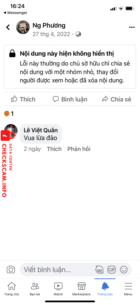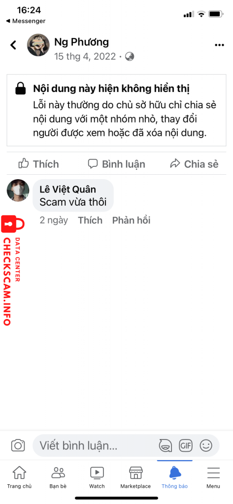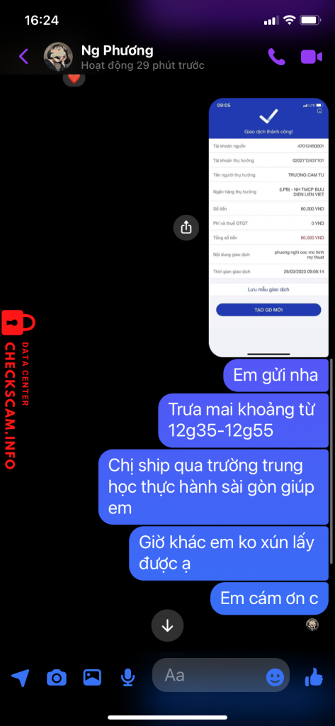 Scammer Alert: Trương Cẩm Tú Reported: November 16, 2024 Scammer Information Full Name: Trương Cẩm Tú Payment Gate: Liên việt Payment Account: 0202712437101 Category: Marketplace scams Source: Checkscam Evidence Files Report Description Kêu mình cọc trước xong scam mình 60k. Mặc dù mình đang rất gấp mà bạn ấy như vậy thì mình không có bài nộp lẫn mất tiền Comments Your comment Add Comment No comments yet. Be the first to share your experience with this scammer.