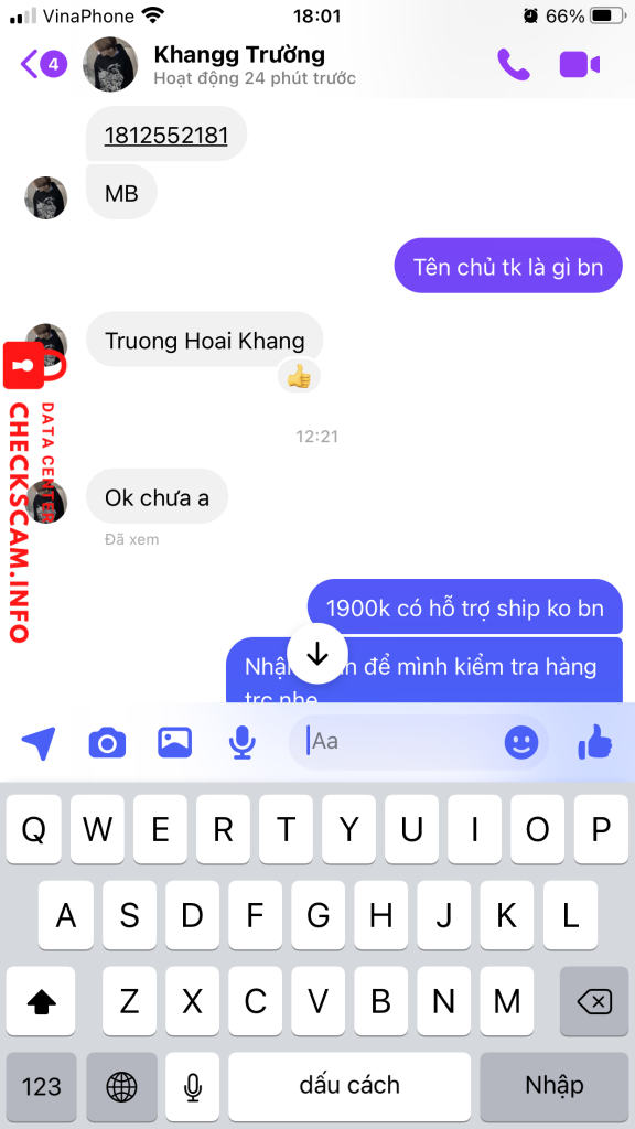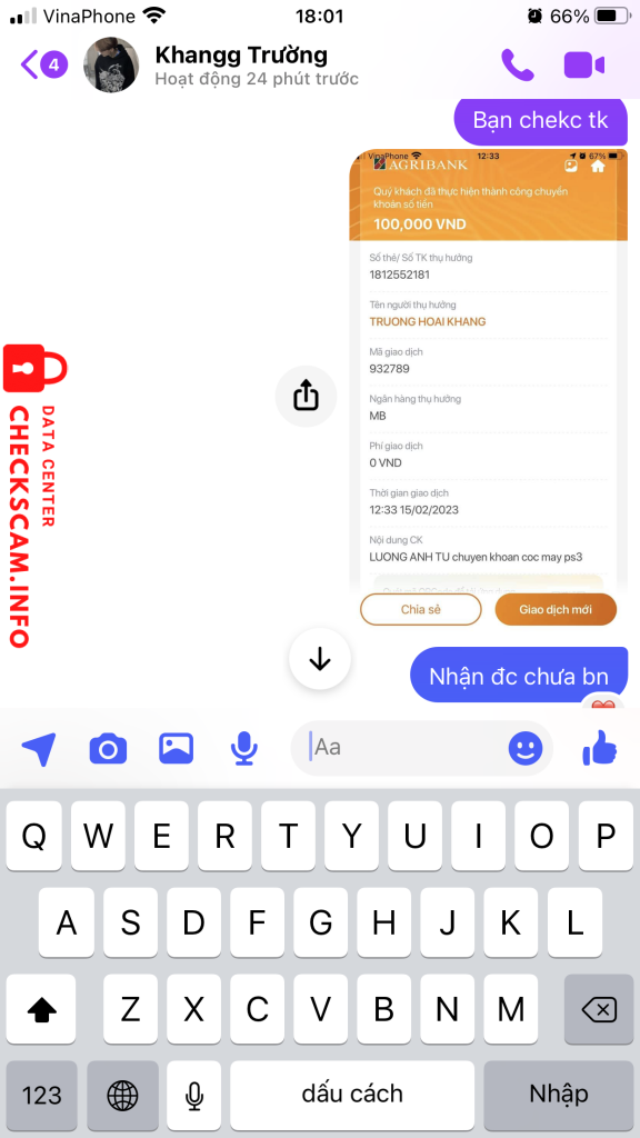 Scammer Alert: Trương hoài khang Reported: November 16, 2024 Scammer Information Full Name: Trương hoài khang Payment Gate: MB Bank Payment Account: 1812552181 Category: Marketplace scams Source: Checkscam Evidence Files Report Description Cọc tiền mua máy PS3 của thằng này sau đó nó khoá bài viết, không vào được facebook cá nhân nữa Comments Your comment Add Comment No comments yet. Be the first to share your experience with this scammer.
