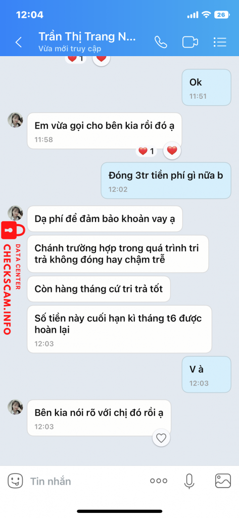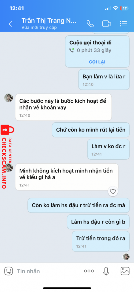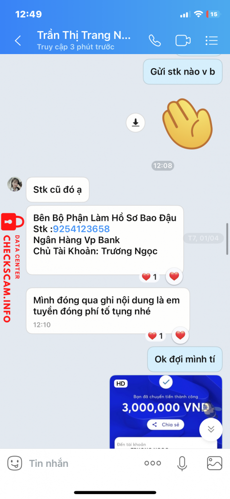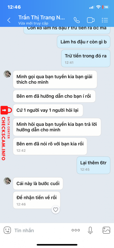 Lừa đảo cho vay tiền , báo làm hồ sơ đậu r nhưng vẫn đòi ck để duyệt tài khoản đã ck 3tr4 làm hồ sơ nhưng khi ck xong lại bảo ck thêm 6tr bên mình ko đồng ý nhận lại tiền 3tr nhưng ko trả lời và ko trả tiền lừa đảo chiếm đoạn tiền nhé ad