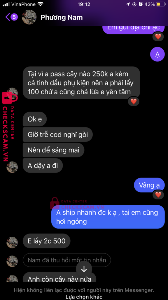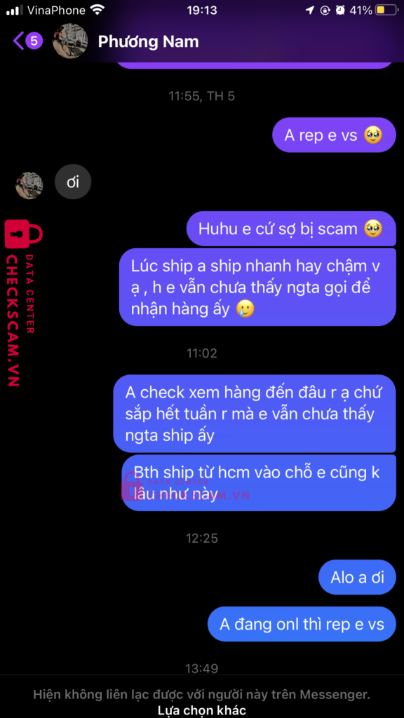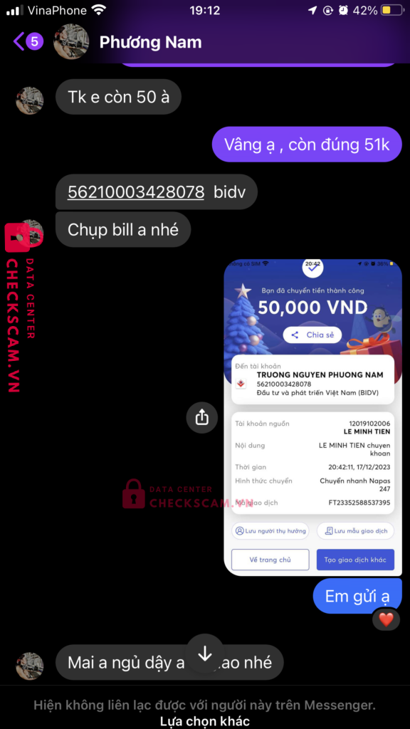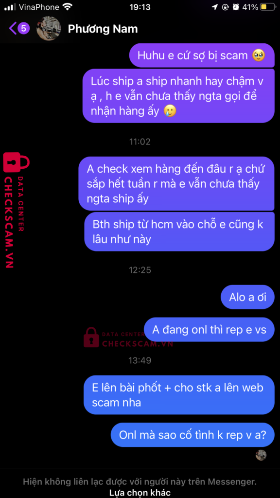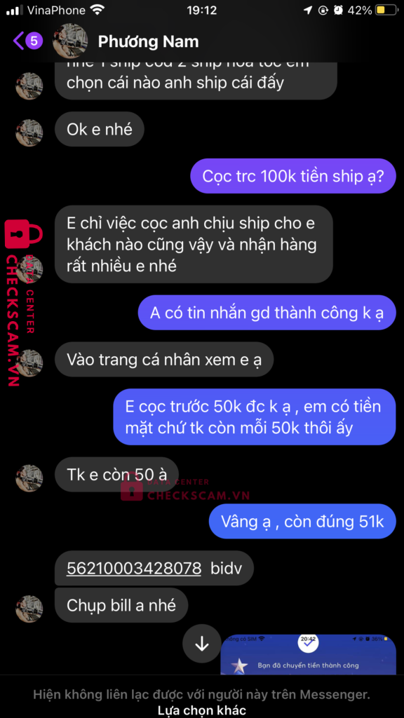 Scammer Alert: Truong Nguyen Phuong Nam Reported: November 16, 2024 Scammer Information Full Name: Truong Nguyen Phuong Nam Payment Gate: Bidv Payment Account: 56210003428078 Category: Marketplace scams Source: Checkscam Evidence Files Report Description Scam mua hàng trên face , đã chuyển khoản đủ nhưng không giao hàng mà block Comments Your comment Add Comment No comments yet. Be the first to share your experience with this scammer.