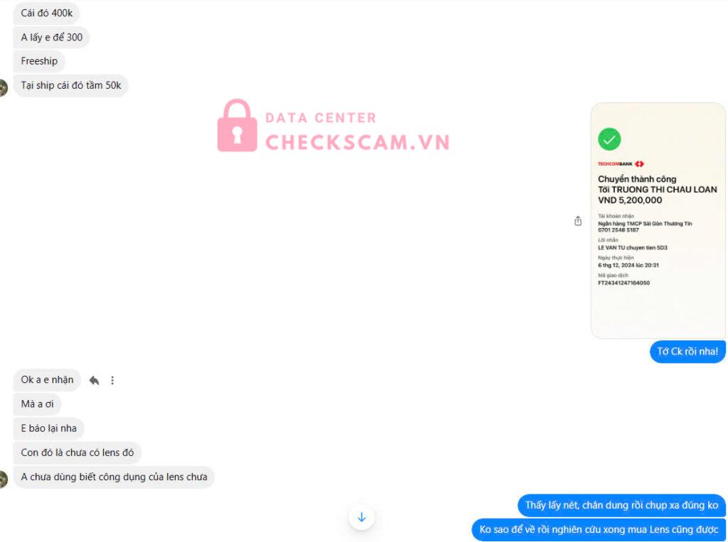 Scammer Alert: Trương Thị Châu Loan Reported: March 7, 2025 Scammer Information Full Name: Trương Thị Châu Loan Payment Gate: Sacombank Payment Account: 070125485187 Category: Marketplace scams Source: Checkscam Evidence Files Report Description Lê Quang Thắng lừa bán máy ảnh và lens rồi không chuyển hàng Comments Your comment Add Comment No comments yet. Be the first to share your experience with this scammer.