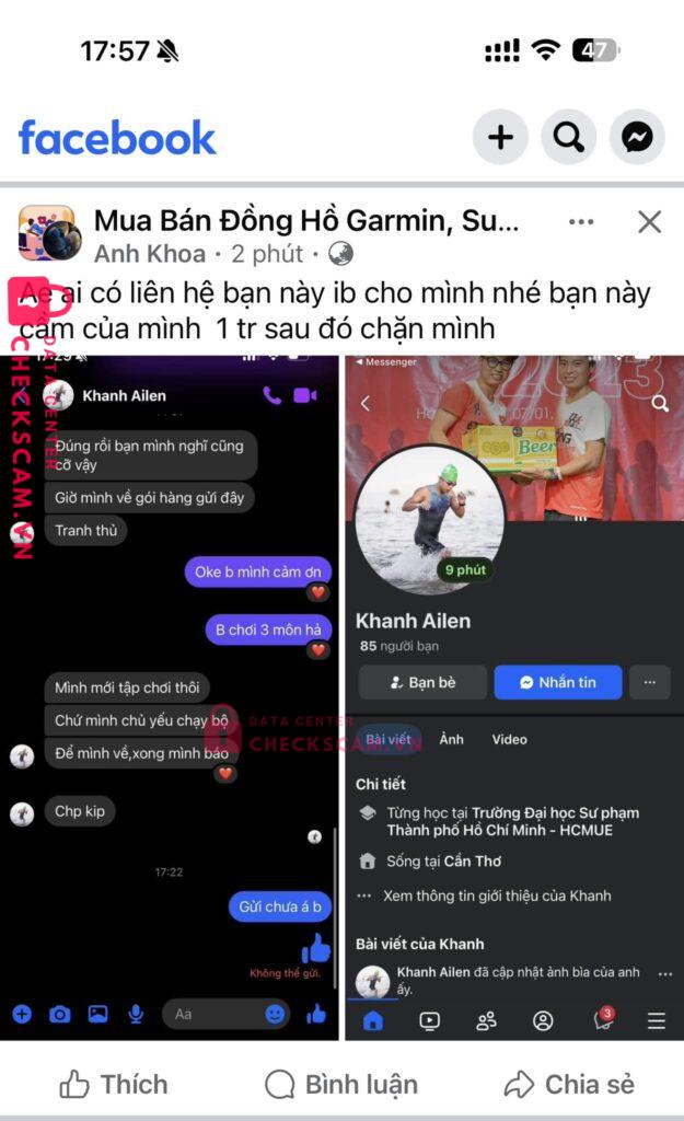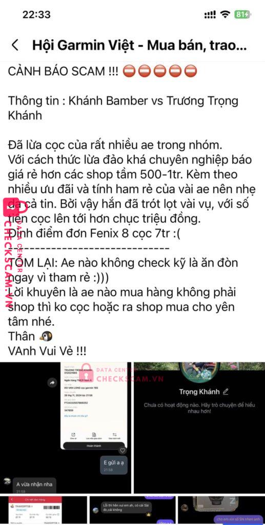 Scammer Alert: TRUONG TRONG KHANH Reported: March 7, 2025 Scammer Information Full Name: TRUONG TRONG KHANH Payment Gate: Nam Á Bank Payment Account: 012031985 Category: Marketplace scams Source: Checkscam Evidence Files Report Description Lừa đảo nhiều người trên nhóm fb, lừa cọc lên đến 2tr, lừa mua đồng hồ Garmin giá rẻ Comments Your comment Add Comment No comments yet. Be the first to share your experience with this scammer.