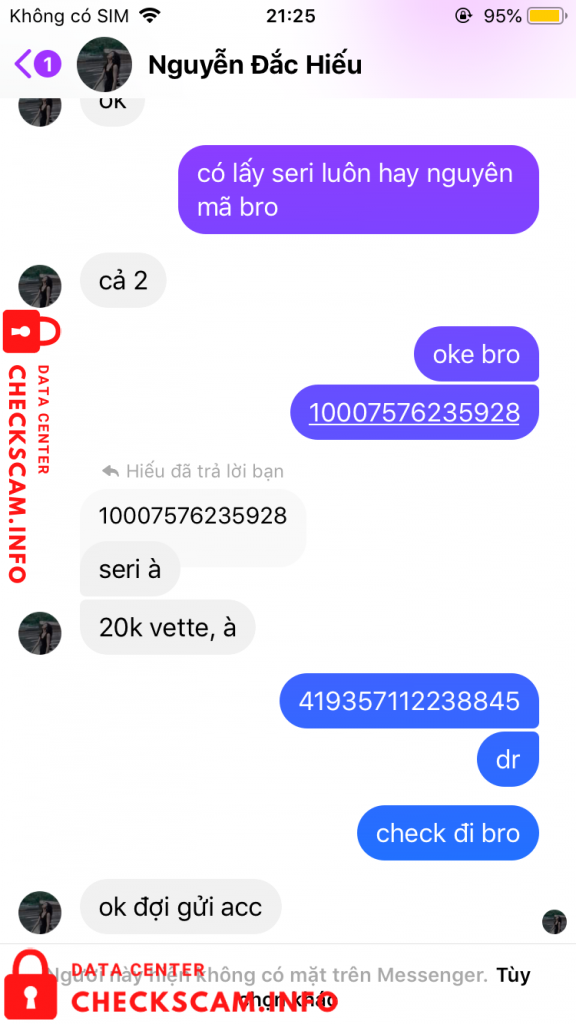 Scammer Alert: Tuyet Thi Tuyet Mai Reported: November 16, 2024 Scammer Information Full Name: Tuyet Thi Tuyet Mai Payment Gate: mb bank Payment Account: 3456786797979 Category: Marketplace scams Source: Checkscam Evidence Files Report Description scam bán acc cổ Comments Your comment Add Comment No comments yet. Be the first to share your experience with this scammer.