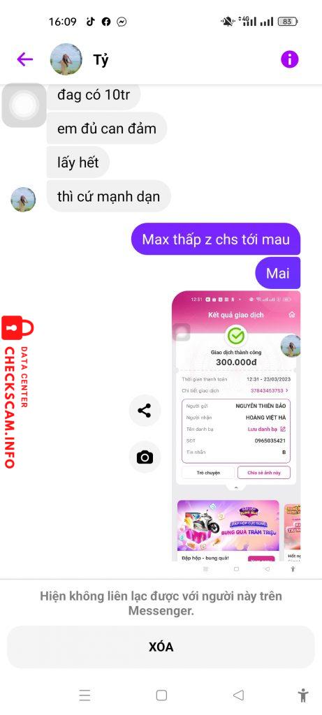 Scammer Alert: Tỷ Tỷ ( Hà ) Reported: November 16, 2024 Scammer Information Full Name: Tỷ Tỷ ( Hà ) Phone Number: 0965035421 Payment Gate: Mb bank Payment Account: 0965035421 Category: Marketplace scams Source: Checkscam Evidence Files Report Description Nó giả danh thu mua acc we chat rồi lợi dụng tổ chức cờ bạc rồi lừa đảo Comments Your comment Add Comment No comments yet. Be the first to share your experience with this scammer.