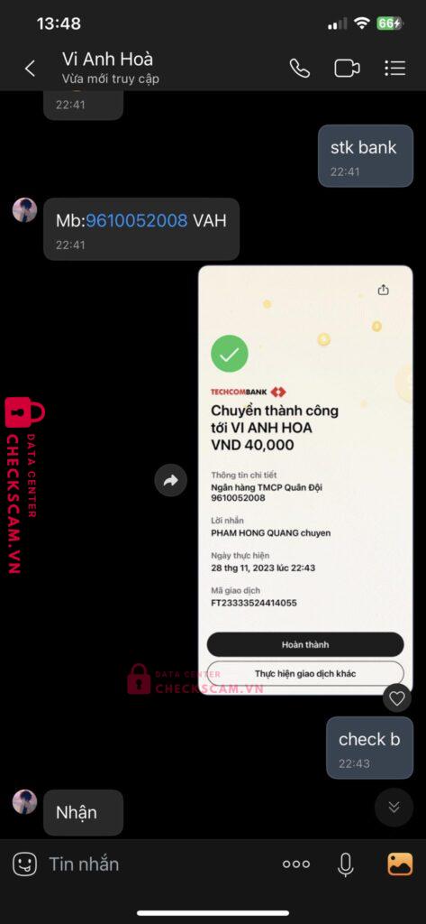 Scammer Alert: VI ANH HOA Reported: November 16, 2024 Scammer Information Full Name: VI ANH HOA Payment Gate: Mbank Payment Account: 9610052008 Category: Marketplace scams Source: Checkscam Evidence Files Report Description Scam 40k mua acc Comments Your comment Add Comment No comments yet. Be the first to share your experience with this scammer.