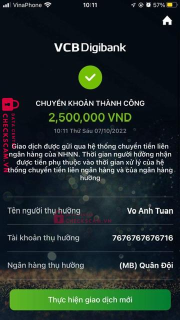 Scammer Alert: Vo anh tuan Reported: November 16, 2024 Scammer Information Full Name: Vo anh tuan Phone Number: 0855555276 Payment Gate: Mbbank Payment Account: 7676767676716 Category: Marketplace scams Source: Checkscam Evidence Files Report Description Comments Your comment Add Comment No comments yet. Be the first to share your experience with this scammer.