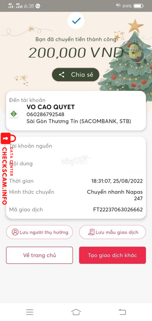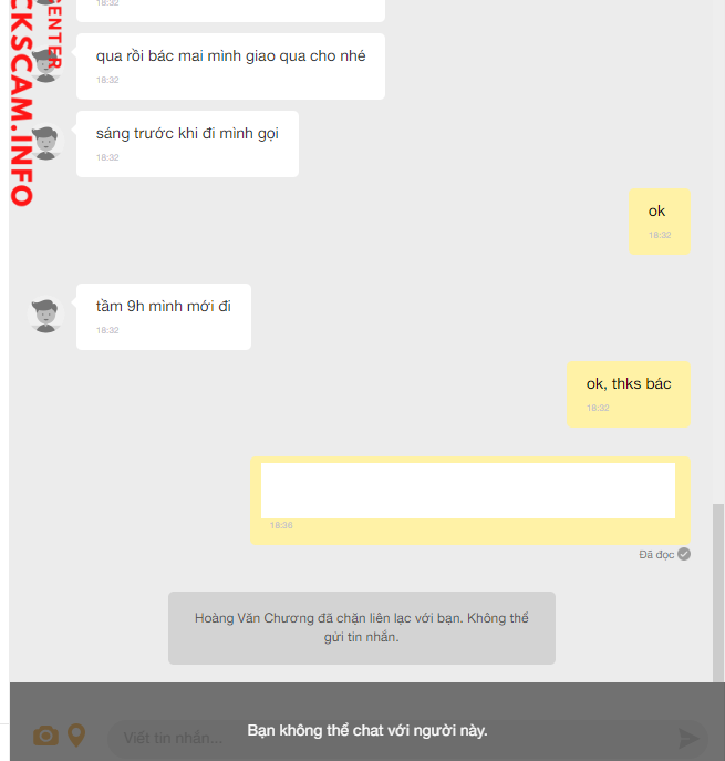 Scammer Alert: Võ Cao Quyết Reported: November 16, 2024 Scammer Information Full Name: Võ Cao Quyết Payment Gate: Sacombank Payment Account: 060286792548 Category: Marketplace scams Source: Checkscam Evidence Files Report Description Lừa đảo qua chợ tốt, đòi cọc sau đó chặn và biến mất Comments Your comment Add Comment No comments yet. Be the first to share your experience with this scammer.