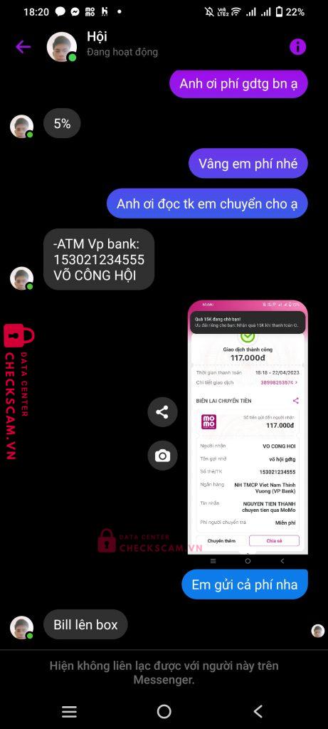 Scammer Alert: VO CONG HOI Reported: November 16, 2024 Scammer Information Full Name: VO CONG HOI Payment Gate: Vpbank Payment Account: 153021234555 Category: Marketplace scams Source: Checkscam Evidence Files Report Description Lừa lòng tin Comments Your comment Add Comment No comments yet. Be the first to share your experience with this scammer.