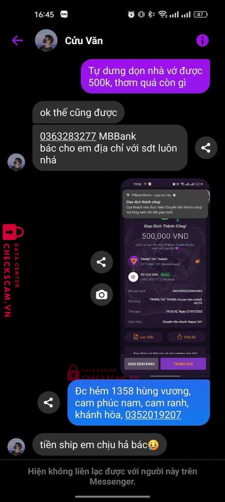 Scammer Alert: VO CUU VAN Reported: November 16, 2024 Scammer Information Full Name: VO CUU VAN Phone Number: 0363283277 Payment Gate: MBBANK Payment Account: 0363283277 Category: Marketplace scams Source: Checkscam Evidence Files Report Description Lừa đảo chuyển khoản bán Router nhưng không chuyển hàng Comments Your comment Add Comment No comments yet. Be the first to share your experience with this scammer.