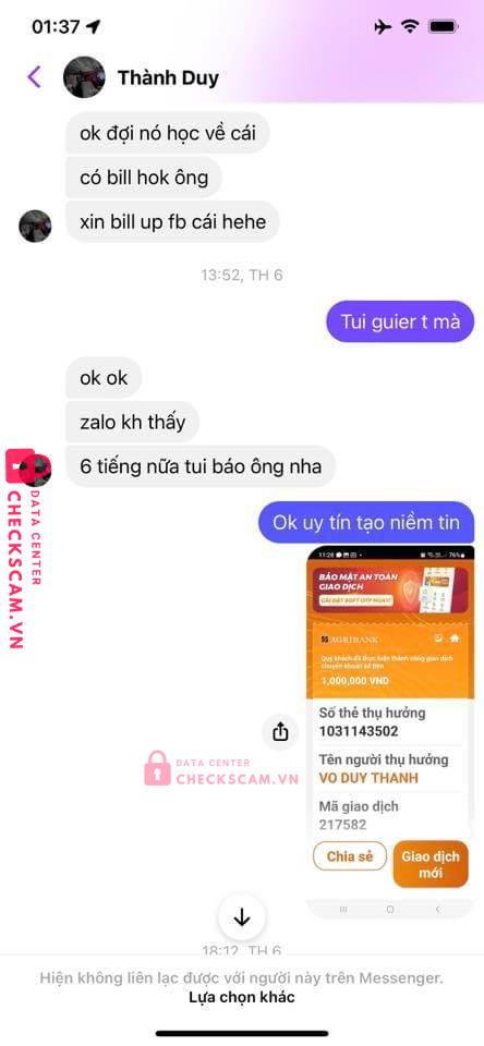 Scammer Alert: VO DUY THANH Reported: November 16, 2024 Scammer Information Full Name: VO DUY THANH Payment Gate: Vietcombank Payment Account: 1031143502 Category: Marketplace scams Source: Checkscam Evidence Files Report Description Mua acc đã chuyển khoản đầy đủ và bị block fb zalo Comments Your comment Add Comment No comments yet. Be the first to share your experience with this scammer.