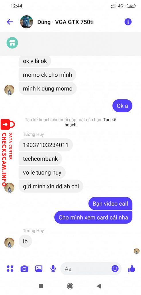 Scammer Alert: Võ Lê Tường Huy Reported: November 16, 2024 Scammer Information Full Name: Võ Lê Tường Huy Payment Gate: Techcombank Payment Account: 19037103234011 Category: Marketplace scams Source: Checkscam Evidence Files Report Description Lừa đảo tiền bán vga card của ae Comments Your comment Add Comment No comments yet. Be the first to share your experience with this scammer.