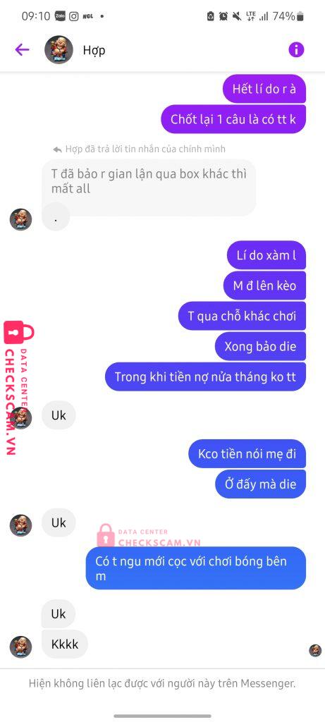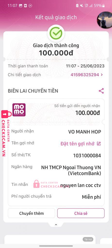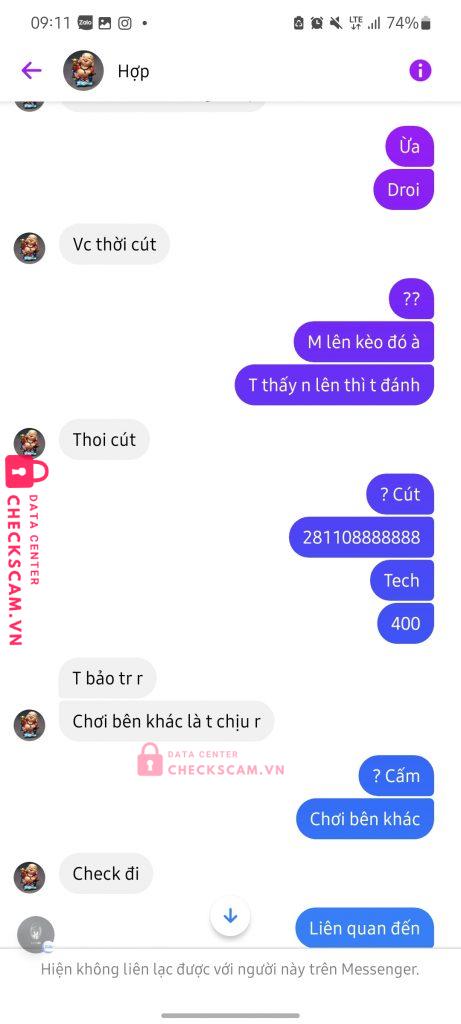 Scammer Alert: Võ Mạnh Hợp Reported: November 16, 2024 Scammer Information Full Name: Võ Mạnh Hợp Phone Number: 0346818929 Payment Gate: Vietcombank Payment Account: 1031000084 Category: Marketplace scams Source: Checkscam Evidence Files Report Description Ôm bóng nợ 400 nửa tháng không tt + scam cọc 100k + phí pr box kéo mem Comments Your comment Add Comment No comments yet. Be the first to share your experience with this scammer.