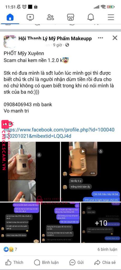 scammer từ lâu, stk thay đổi liên tục nên có thể là mua stk rác. lừa bên mỹ phẩm, quần áo nhiều. ảnh góp nhặt nhiều nơi nên phông nền khác nhau hoàn toàn