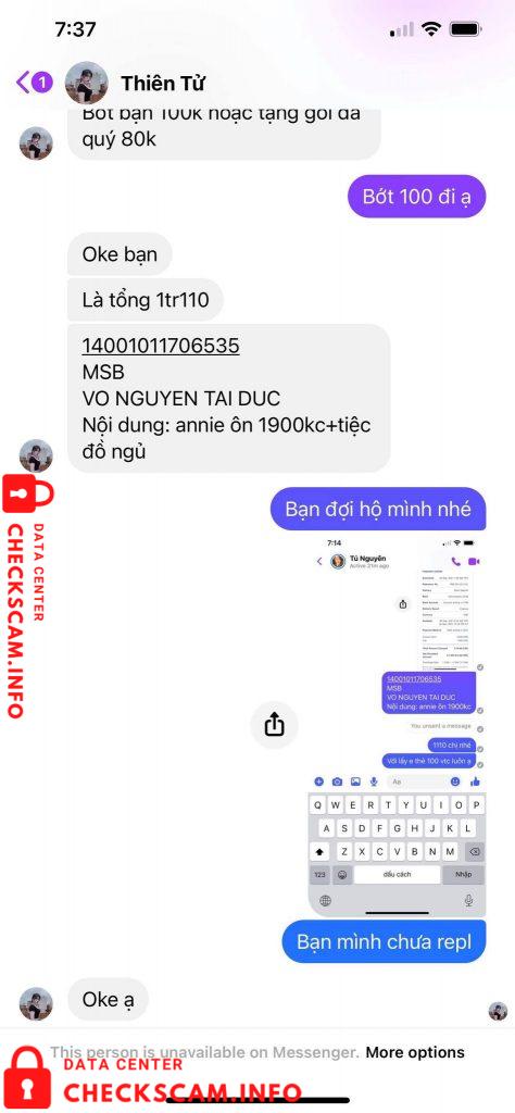 Scammer Alert: Vo Nguyen Tai Duc Reported: November 16, 2024 Scammer Information Full Name: Vo Nguyen Tai Duc Payment Gate: MBS Payment Account: 14001011706535 Category: Marketplace scams Source: Checkscam Evidence Files Report Description Chuyen tien xong chan Comments Your comment Add Comment No comments yet. Be the first to share your experience with this scammer.