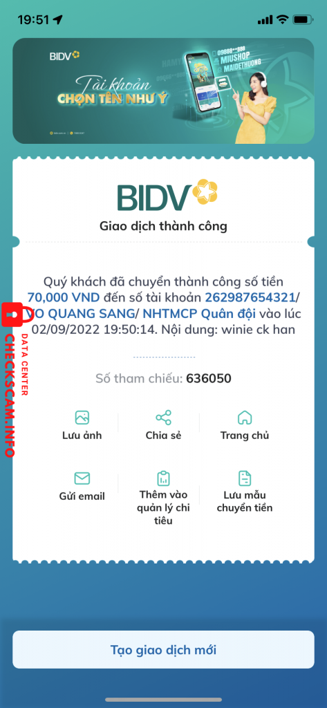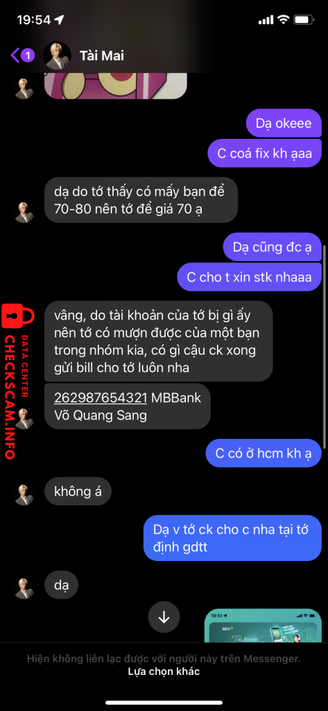 Scammer Alert: Võ Quang Sang Reported: November 16, 2024 Scammer Information Full Name: Võ Quang Sang Payment Gate: MB Bank Payment Account: 262987654321 Category: Marketplace scams Source: Checkscam Evidence Files Report Description Lừa đảo scam card Comments Your comment Add Comment No comments yet. Be the first to share your experience with this scammer.
