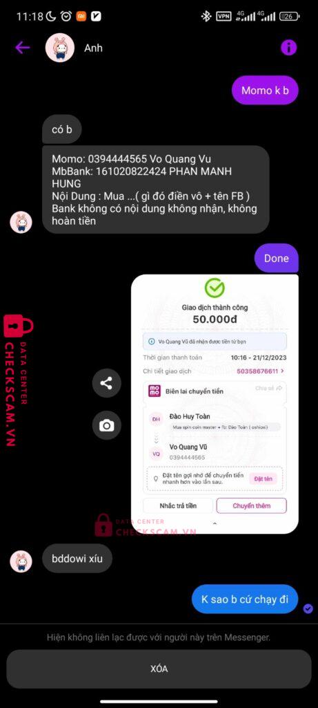 Scammer Alert: Vo Quang Vu Reported: November 16, 2024 Scammer Information Full Name: Vo Quang Vu Payment Gate: Momo Payment Account: 0394444565 Category: Marketplace scams Source: Checkscam Evidence Files Report Description Lừa đảo Comments Your comment Add Comment No comments yet. Be the first to share your experience with this scammer.