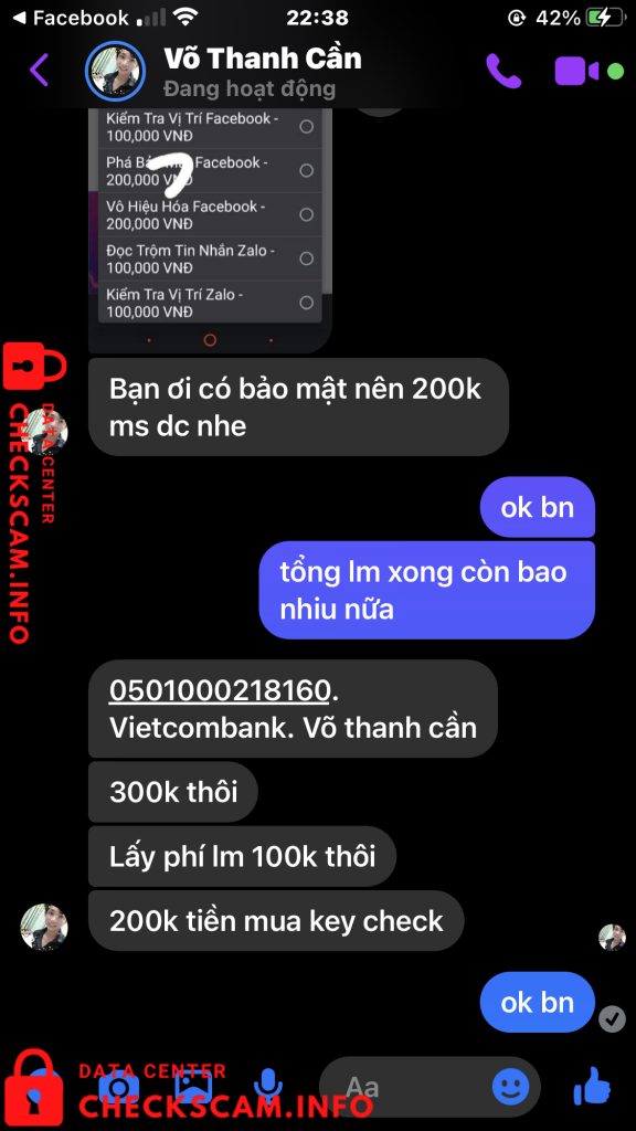 Scammer Alert: Vo Thanh Can Reported: November 16, 2024 Scammer Information Full Name: Vo Thanh Can Payment Gate: vietcombank Payment Account: 0501000218160 Category: Marketplace scams Source: Checkscam Evidence Files Report Description hack lấy mật khẩu fb lừa đảo Comments Your comment Add Comment No comments yet. Be the first to share your experience with this scammer.