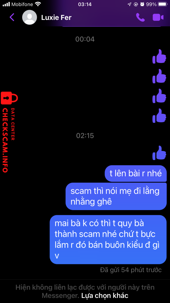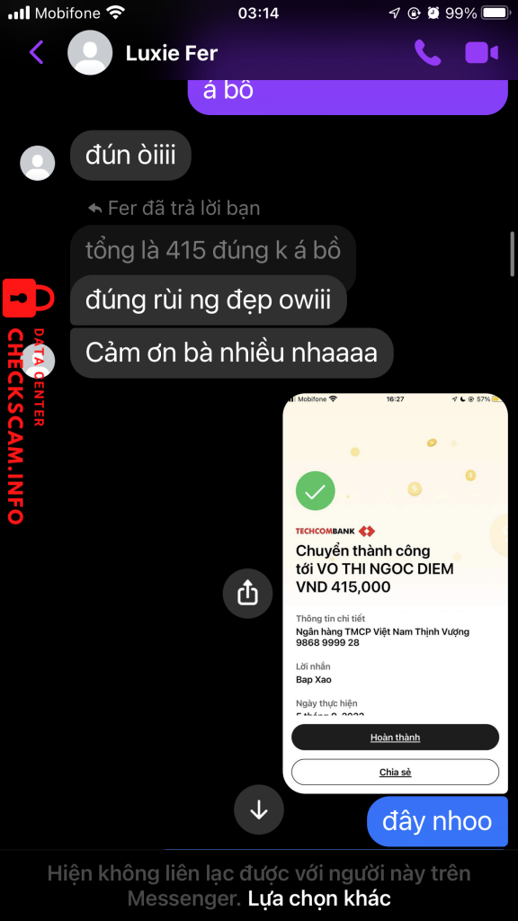Scammer Alert: VO THI NGOC DIEM Reported: November 16, 2024 Scammer Information Full Name: VO THI NGOC DIEM Payment Gate: VP Bank Payment Account: 9868999928 Category: Marketplace scams Source: Checkscam Evidence Files Report Description lấy ảnh mạng đem buôn bán như thật :))) Comments Your comment Add Comment No comments yet. Be the first to share your experience with this scammer.