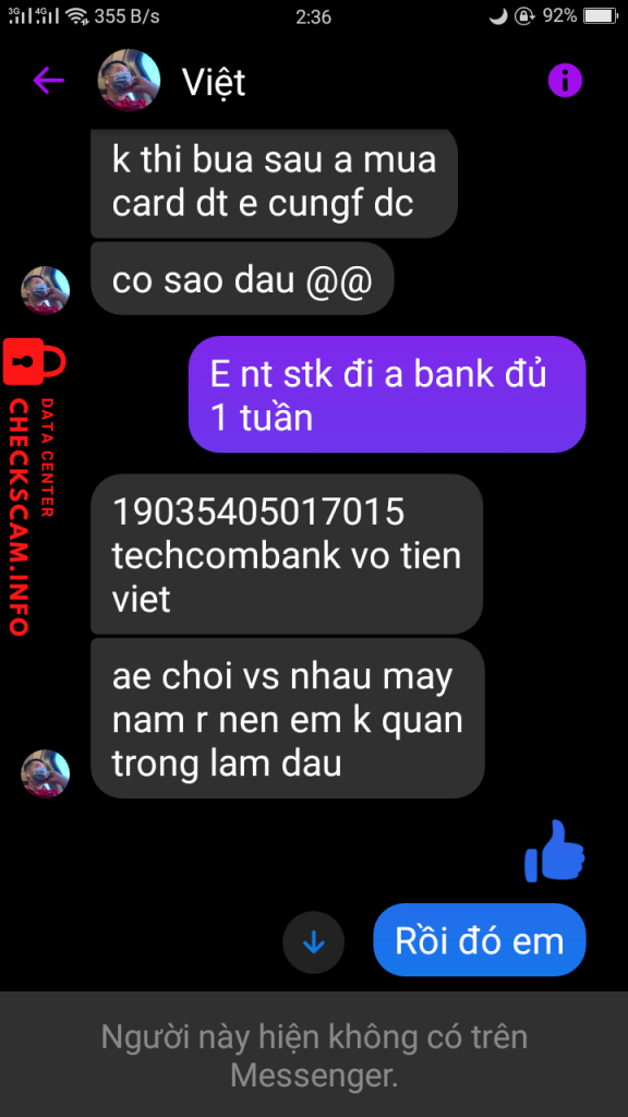 Scammer Alert: Võ Tiến Việt Reported: November 16, 2024 Scammer Information Full Name: Võ Tiến Việt Payment Gate: Techcombank Payment Account: 19035405017015 Category: Marketplace scams Source: Checkscam Evidence Files Report Description Comments Your comment Add Comment No comments yet. Be the first to share your experience with this scammer.