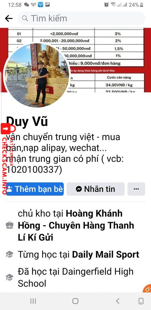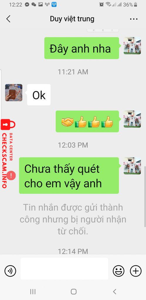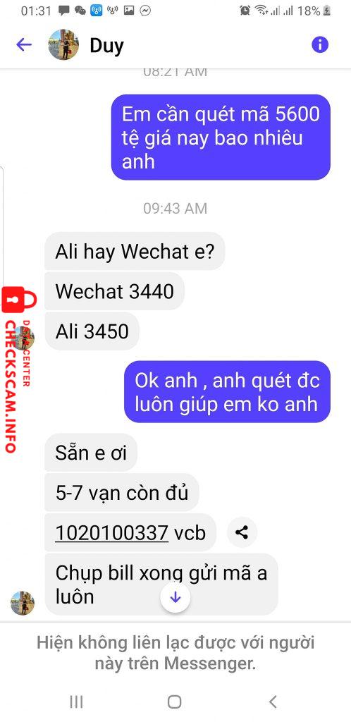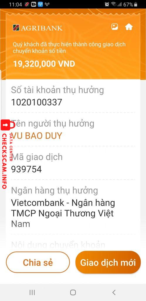 Scammer Alert: VU BAO DUY Reported: November 16, 2024 Scammer Information Full Name: VU BAO DUY Payment Gate: Vietcombank Payment Account: 1020100337 Category: Marketplace scams Source: Checkscam Evidence Files Report Description Lừa đảo mua bán ngoại tệ Comments Your comment Add Comment No comments yet. Be the first to share your experience with this scammer.