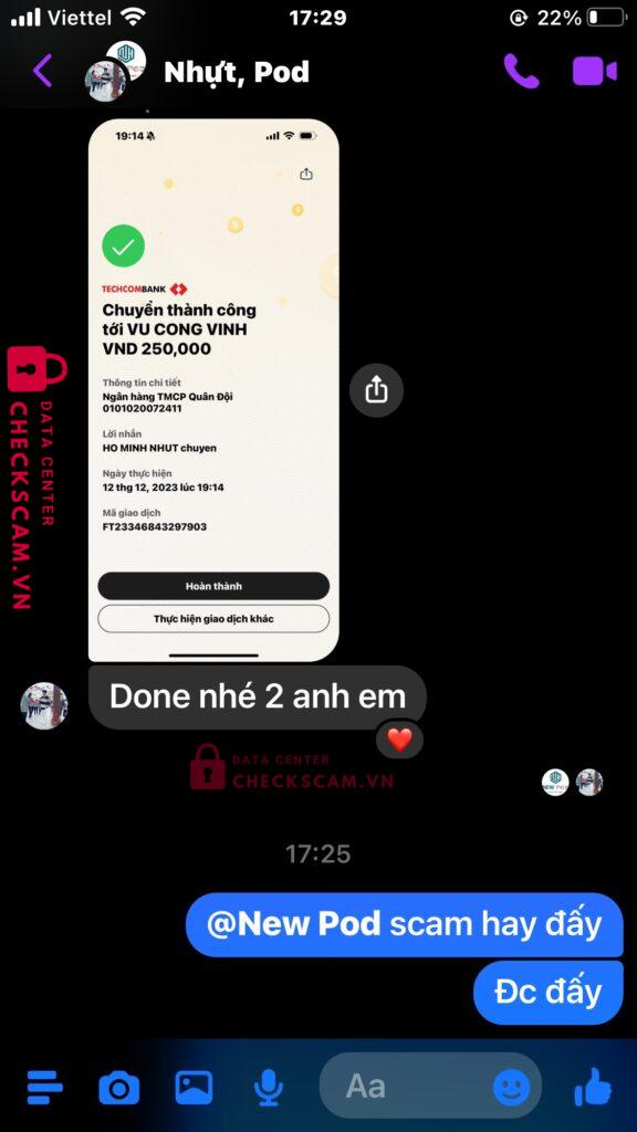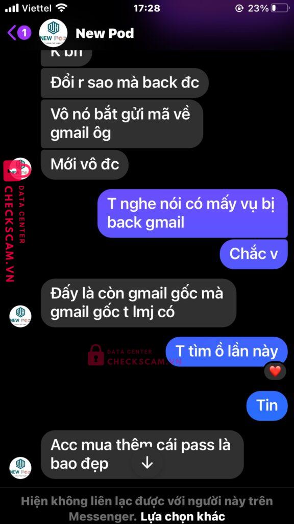Lúc đầu tôi muốn mua acc bên của Vũ Công Vinh và acc Facebook clone của Vinh là New Pod và tôi đã GDTG và bank đủ lấy acc bên Vinh nhưng 1 ngày sau Vinh đã back acc và tôi đã mất tiền Trắng