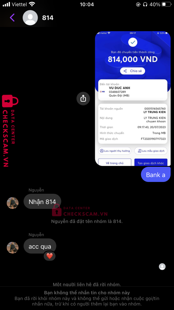 Scammer Alert: VU DUC ANH Reported: November 16, 2024 Scammer Information Full Name: VU DUC ANH Phone Number: 0348607289 Payment Gate: MB BANK Payment Account: 0348607289 Category: Marketplace scams Source: Checkscam Evidence Files Report Description Gdtg 800k bank song block Comments Your comment Add Comment No comments yet. Be the first to share your experience with this scammer.