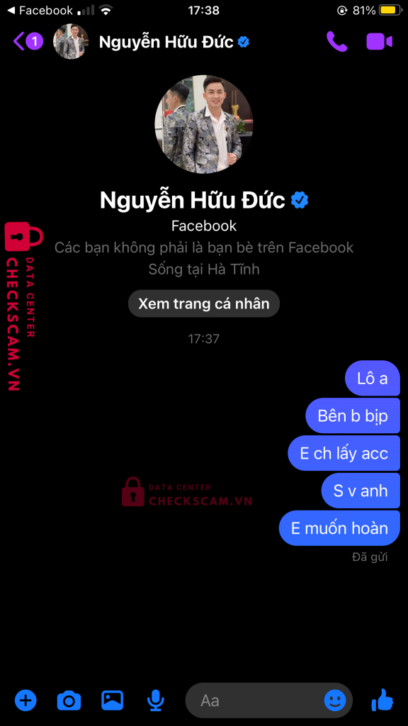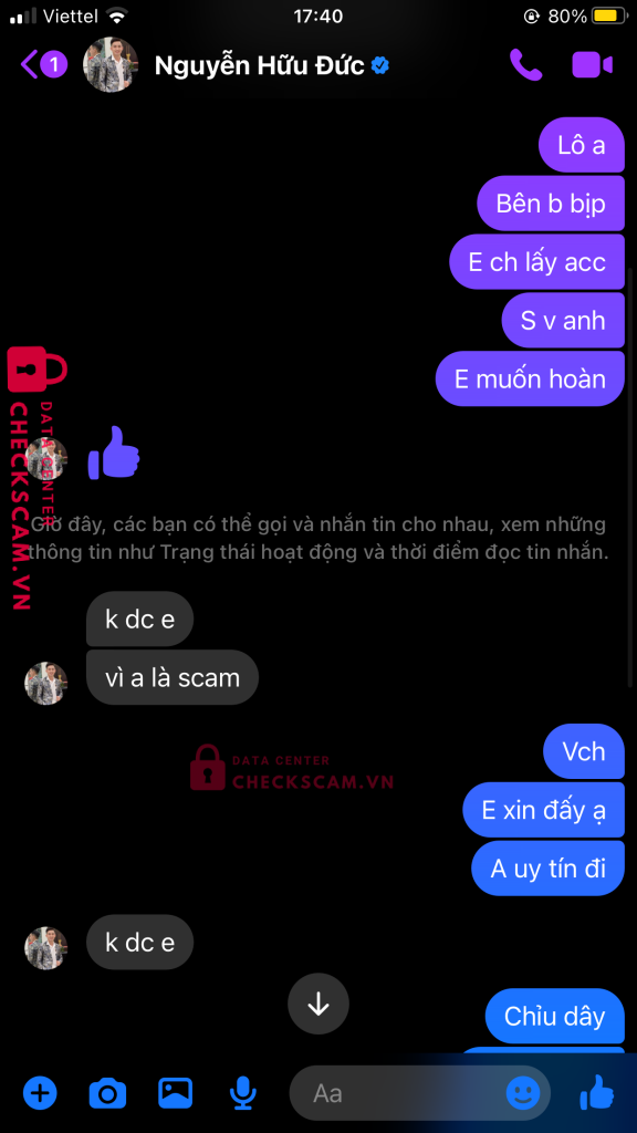 Scammer Alert: VU DUC ANH Reported: November 16, 2024 Scammer Information Full Name: VU DUC ANH Payment Gate: Mbank Payment Account: 0348607289 Category: Marketplace scams Source: Checkscam Evidence Files Report Description Họ lừa e 350k Comments Your comment Add Comment No comments yet. Be the first to share your experience with this scammer.