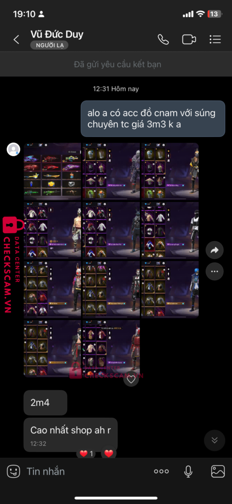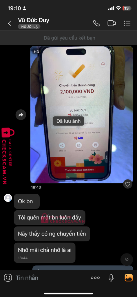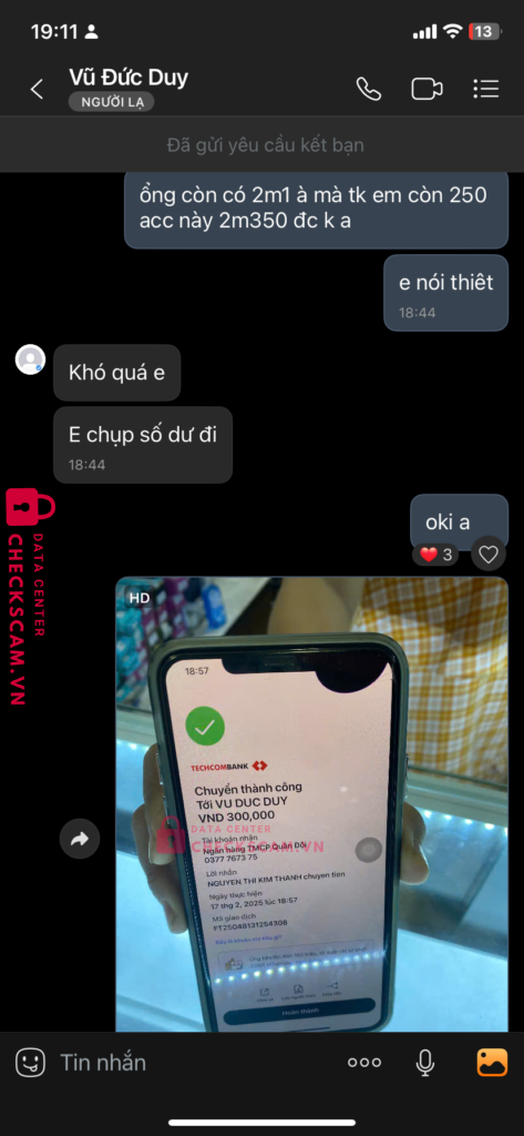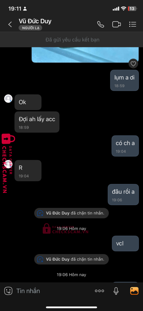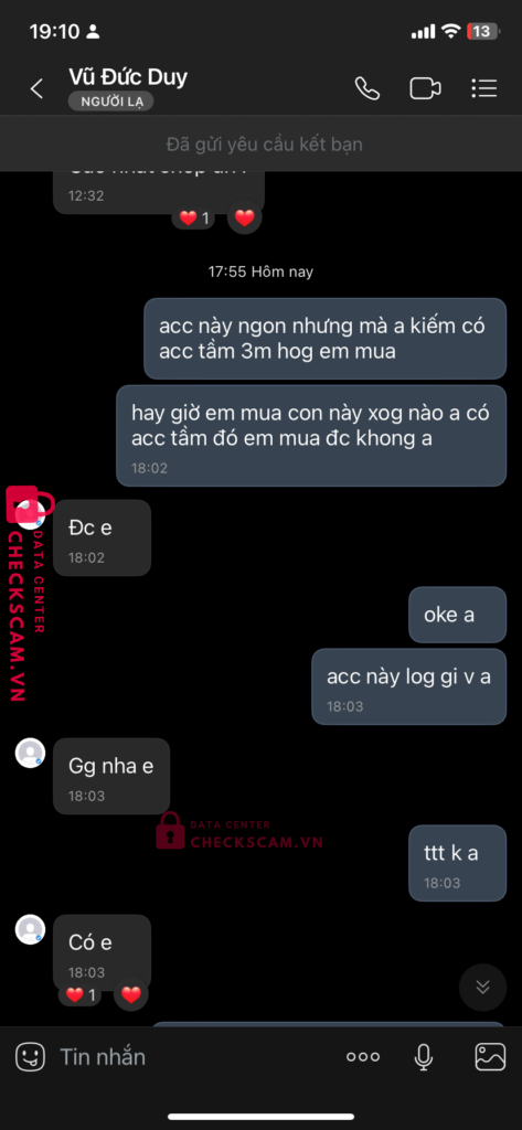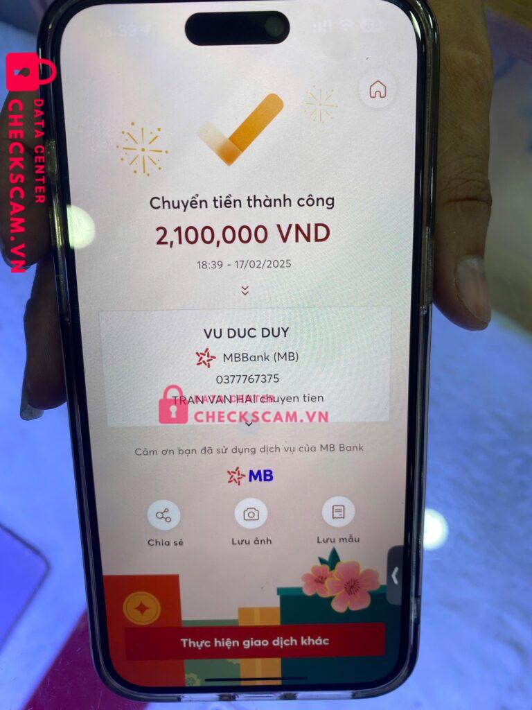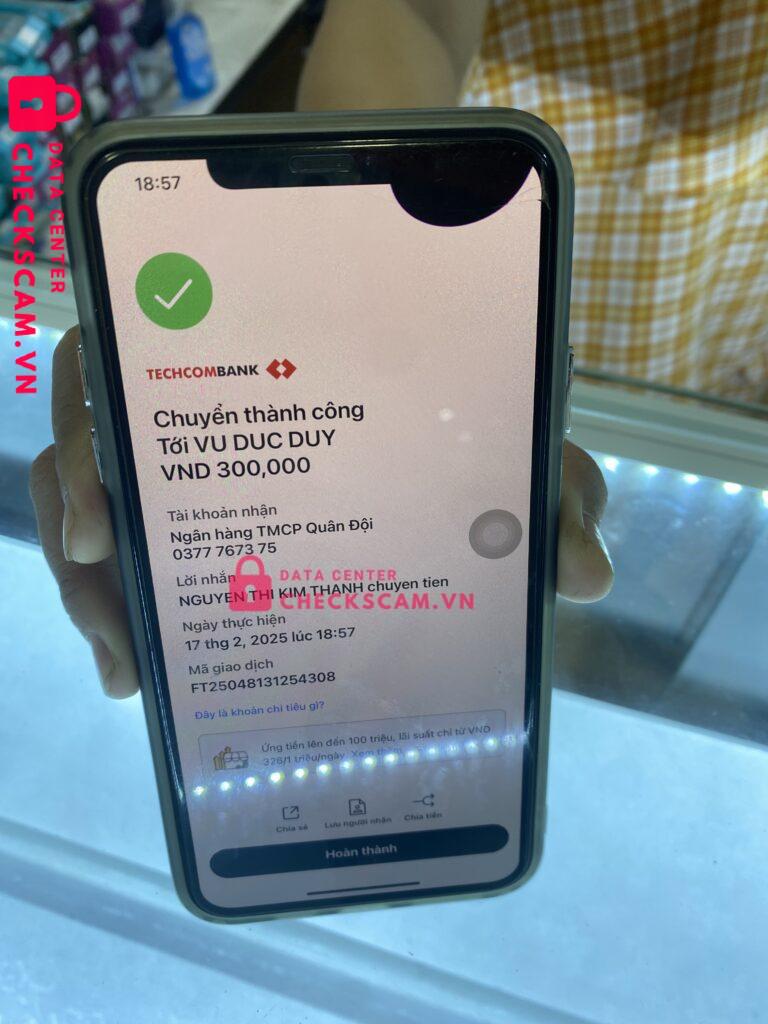 Scammer Alert: Vu Duc Duy Reported: March 7, 2025 Scammer Information Full Name: Vu Duc Duy Payment Gate: MB Payment Account: 0377767375 Category: Marketplace scams Source: Checkscam Evidence Files Report Description idol này sale acc và tôi thấy acc ok nên đã mua và chuyển khoản đủ tiền acc là 2 triệu 4 và bị anh ấy blcok zalo (tiktok là @piaduyff) Comments Your comment Add Comment No comments yet. Be the first to share your experience with this scammer.