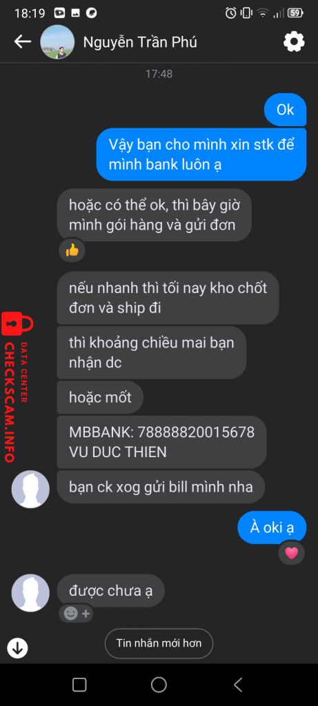 Scammer Alert: VU DUC THIEN Reported: November 16, 2024 Scammer Information Full Name: VU DUC THIEN Phone Number: 0327390535 Payment Gate: MB BANK Payment Account: 78888820015678 Category: Marketplace scams Source: Checkscam Evidence Files Report Description Comments Your comment Add Comment No comments yet. Be the first to share your experience with this scammer.