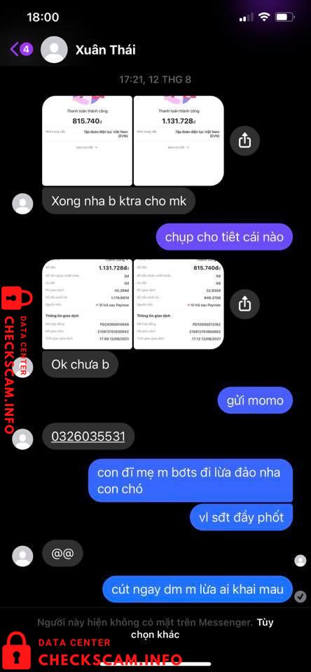 Scammer Alert: Vu Duy Thai Reported: November 16, 2024 Scammer Information Full Name: Vu Duy Thai Phone Number: 0326035531 Payment Gate: MoMo Payment Account: 0867571876 Category: Marketplace scams Source: Checkscam Evidence Files Report Description Rửa tiền qua tk của trung gian Comments Your comment Add Comment No comments yet. Be the first to share your experience with this scammer.