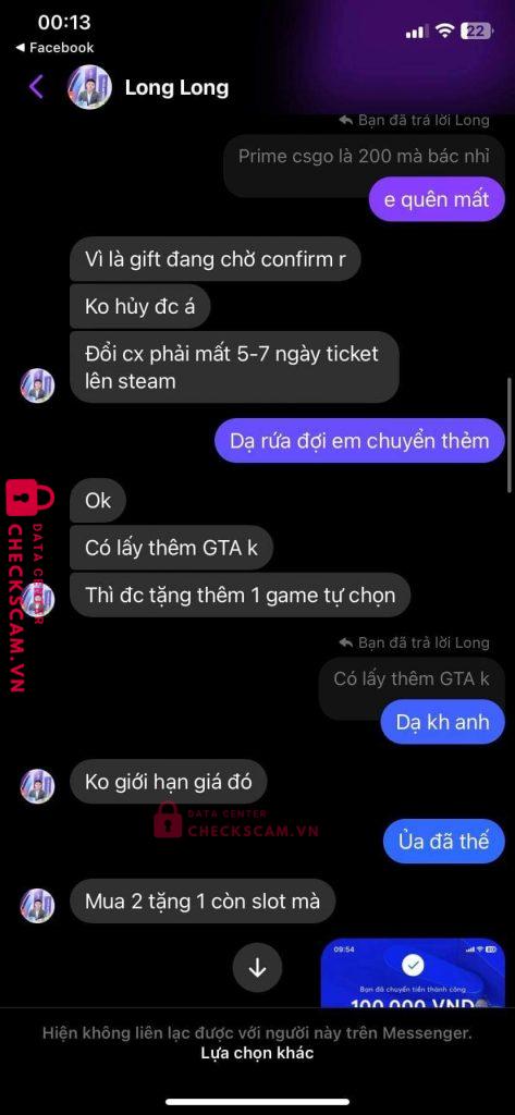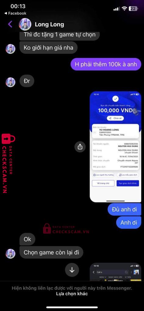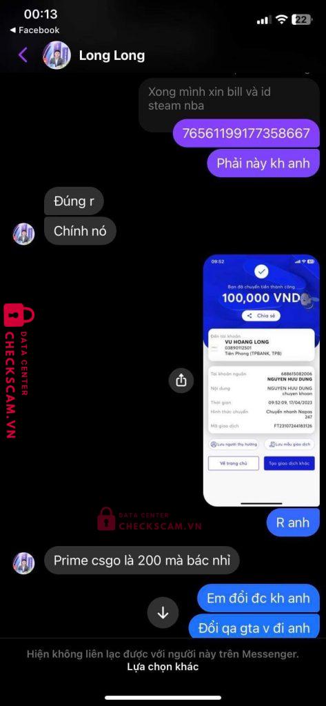 Scammer Alert: VU HOANG LONG Reported: November 16, 2024 Scammer Information Full Name: VU HOANG LONG Payment Gate: TPBank Payment Account: 03890112501 Category: Marketplace scams Source: Checkscam Evidence Files Report Description Lừa đảo về việc bán game trên steam Comments Your comment Add Comment No comments yet. Be the first to share your experience with this scammer.