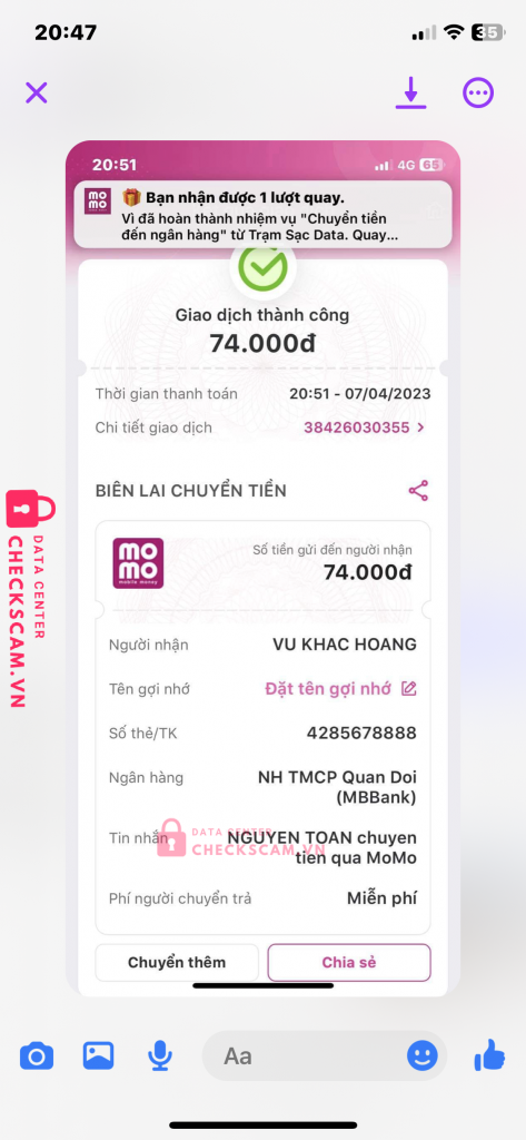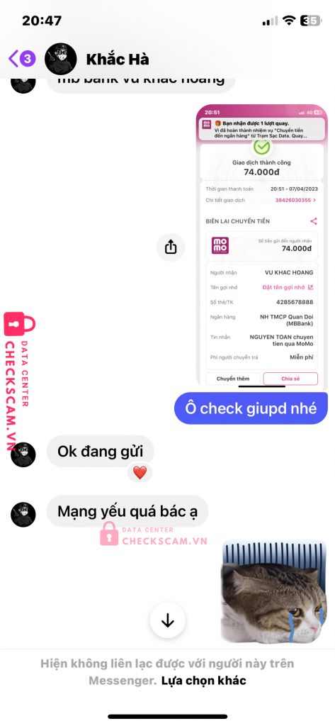 Scammer Alert: Vu Khac Hoang Reported: November 16, 2024 Scammer Information Full Name: Vu Khac Hoang Payment Gate: Mbbank Payment Account: 4285678888 Category: Marketplace scams Source: Checkscam Evidence Files Report Description Lừa đảo bán clone Comments Your comment Add Comment No comments yet. Be the first to share your experience with this scammer.