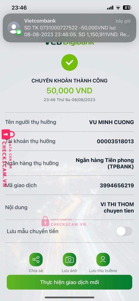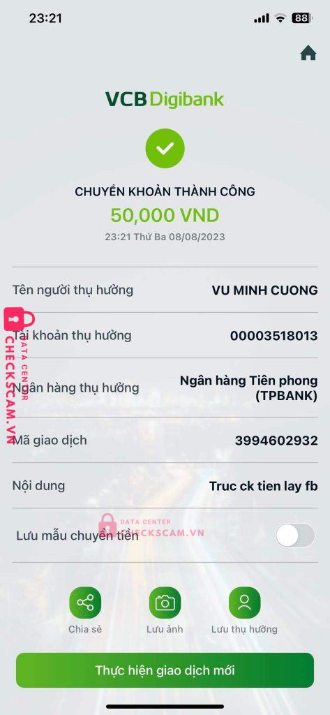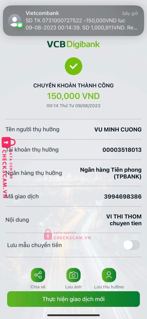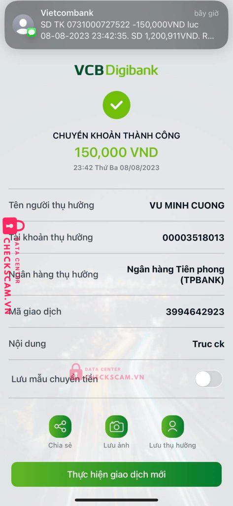 Scammer Alert: VU MINH CUONG Reported: November 16, 2024 Scammer Information Full Name: VU MINH CUONG Payment Gate: TP BANK Payment Account: 00003518013 Category: Marketplace scams Source: Checkscam Evidence Files Report Description Con chó scam Comments Your comment Add Comment No comments yet. Be the first to share your experience with this scammer.