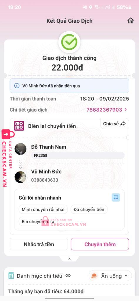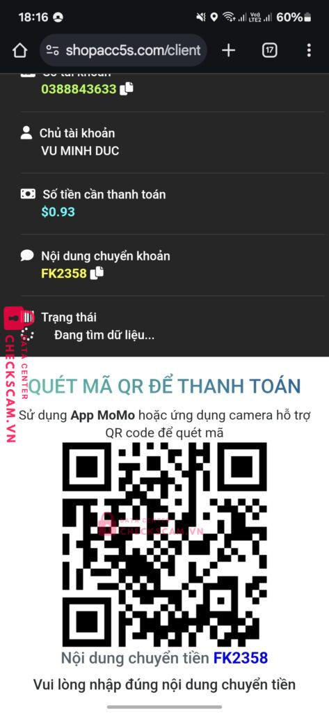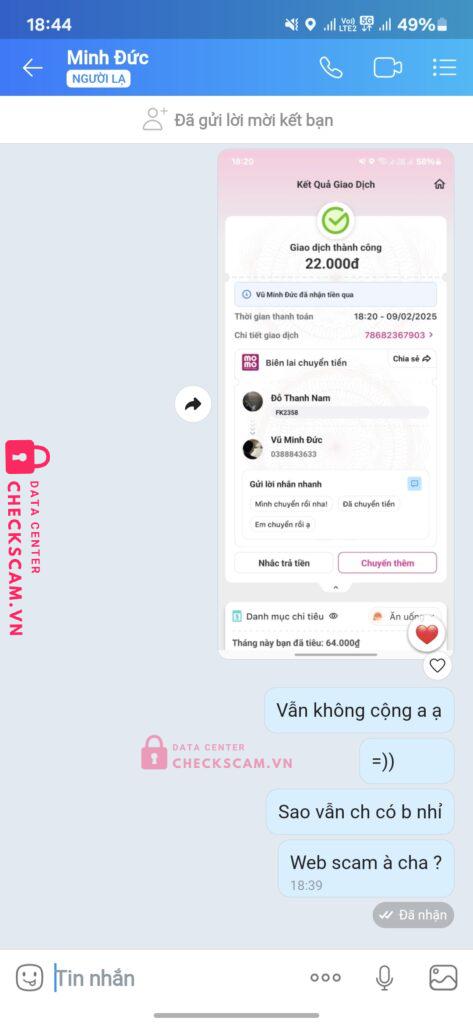 Scammer Alert: Vũ Minh Đức Reported: March 7, 2025 Scammer Information Full Name: Vũ Minh Đức Payment Gate: Momo Payment Account: 01688843633 Category: Marketplace scams Source: Checkscam Evidence Files Report Description Web scam liên hệ ad bắt nạp thêm xong nạp thêm vẫn ko thấy j Comments Your comment Add Comment No comments yet. Be the first to share your experience with this scammer.