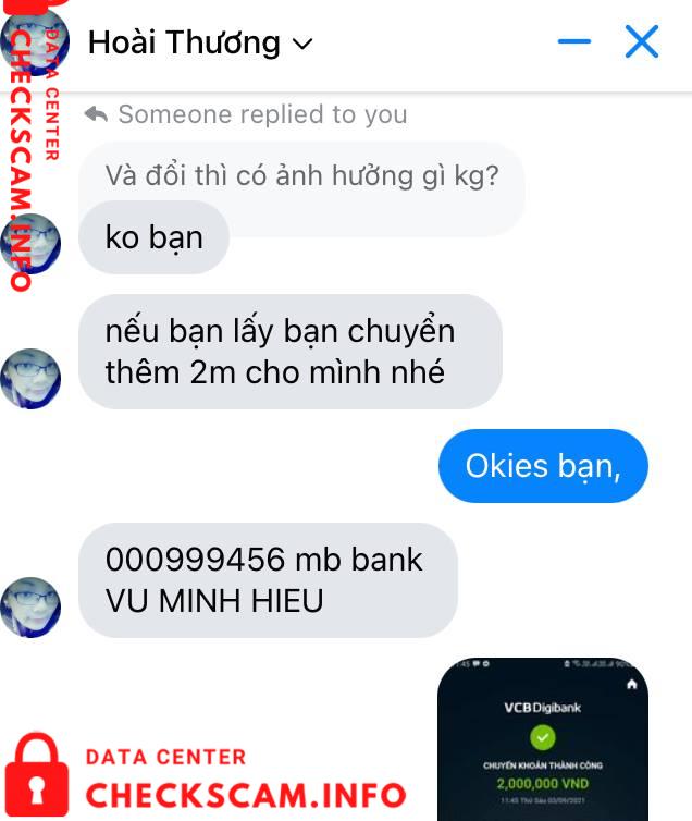 Scammer Alert: Vu Minh Hieu Reported: November 16, 2024 Scammer Information Full Name: Vu Minh Hieu Payment Gate: MB Bank Payment Account: 000999456 Category: Marketplace scams Source: Checkscam Evidence Files Report Description Góc lừa đảo. Các bạn gặp em gái xinh xinh ăn nói dễ thương này thì chạy đi nhé, mình mới bị bay 3M. STK: 000999456 mb bank VU MINH HIEU Comments Your comment Add Comment No comments yet. Be the first to share your experience with this scammer.