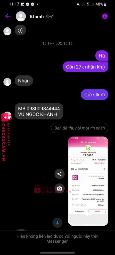 Scammer Alert: Vũ Ngọc Khánh Reported: November 16, 2024 Scammer Information Full Name: Vũ Ngọc Khánh Payment Gate: Mb Bank Payment Account: 098009844444 Category: Marketplace scams Source: Checkscam Evidence Files Report Description Comments Your comment Add Comment No comments yet. Be the first to share your experience with this scammer.