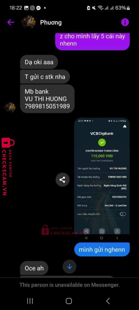 Scammer Alert: Vu thi huong Reported: November 16, 2024 Scammer Information Full Name: Vu thi huong Payment Gate: VCBDIGbank Payment Account: 7989815051989 Category: Marketplace scams Source: Checkscam Evidence Files Report Description Hồi tháng 3 này tui và bạn bị một con tên Kiều Phương Scam với stk VU THI HUONG và nó xoá tài khoản ngay khi nó block bạn tui Comments Your comment Add Comment No comments yet. Be the first to share your experience with this scammer.