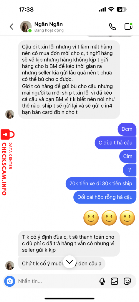 Scammer Alert: Vũ Thị Ngoan Reported: November 16, 2024 Scammer Information Full Name: Vũ Thị Ngoan Phone Number: 0986444779 Payment Gate: MoMo Payment Account: 0986444779 Category: Marketplace scams Source: Checkscam Evidence Files Report Description Mua card bo góc nhưng khi ship chỉ nhận được hộp đồng hồ rỗng. Sau khi ship lại đợt 2 thì vẫn ko có card mà có đống giấy rác Comments Your comment Add Comment No comments yet. Be the first to share your experience with this scammer.