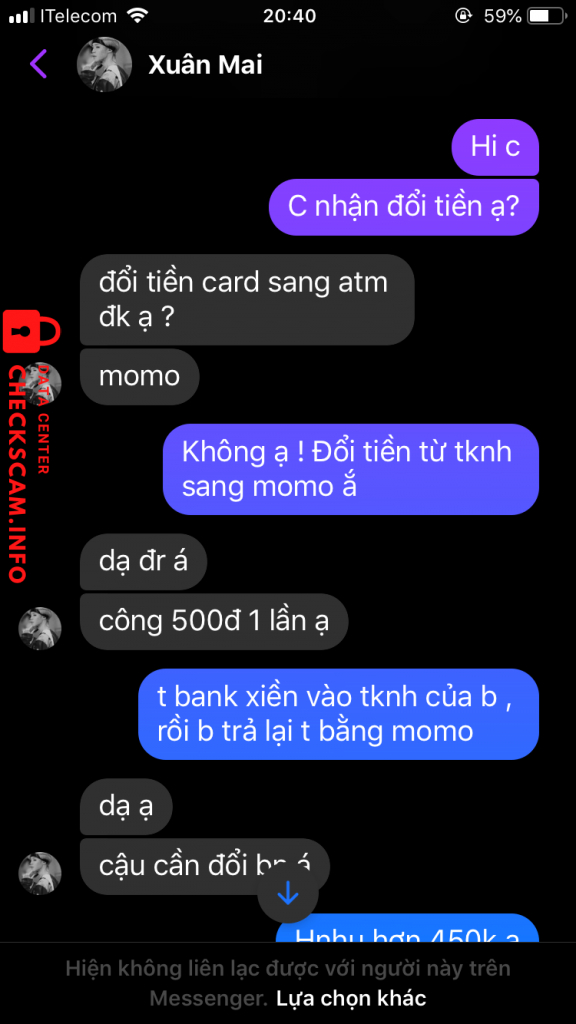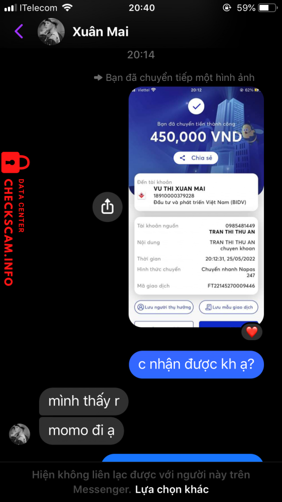 Scammer Alert: Vu Thi Xuan Mai Reported: November 16, 2024 Scammer Information Full Name: Vu Thi Xuan Mai Payment Gate: Bidv Payment Account: 18910000379228 Category: Marketplace scams Source: Checkscam Evidence Files Report Description Lúc nhắn thì dthw thấy sợ mà s scam ngta vậy b? Comments Your comment Add Comment No comments yet. Be the first to share your experience with this scammer.