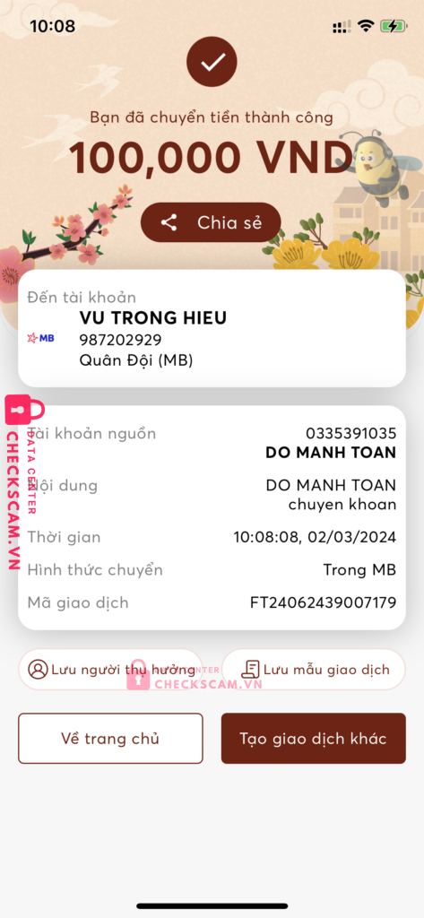 Scammer Alert: Vu Trong Hieu Reported: November 16, 2024 Scammer Information Full Name: Vu Trong Hieu Payment Gate: Mb bank Payment Account: 987202929 Category: Marketplace scams Source: Checkscam Evidence Files Report Description Lừa đảo giao dịch Comments Your comment Add Comment No comments yet. Be the first to share your experience with this scammer.