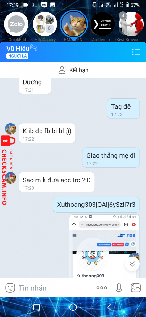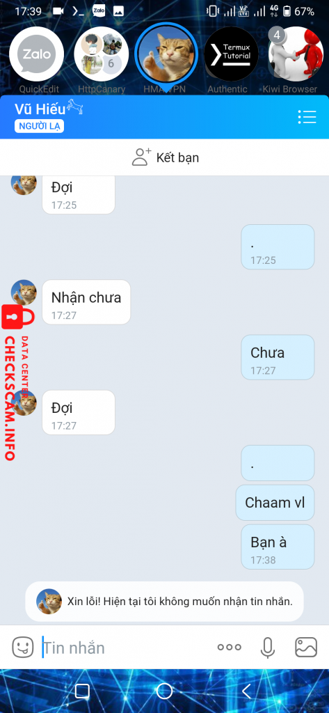 Scammer Alert: Vu Trung Hieu Reported: November 16, 2024 Scammer Information Full Name: Vu Trung Hieu Phone Number: 0379098071 Payment Gate: Momo Payment Account: 0379098071 Category: Marketplace scams Source: Checkscam Evidence Files Report Description Scam xu trao đổi sub, thể loại k đáng để nói ae cẩn thận Comments Your comment Add Comment No comments yet. Be the first to share your experience with this scammer.