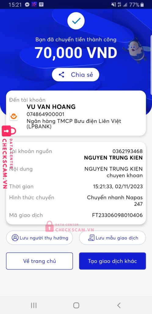 Scammer Alert: vũ văn hoàng Reported: November 16, 2024 Scammer Information Full Name: vũ văn hoàng Payment Gate: MB Payment Account: 074864900001 Category: Marketplace scams Source: Checkscam Evidence Files Report Description scam Comments Your comment Add Comment No comments yet. Be the first to share your experience with this scammer.