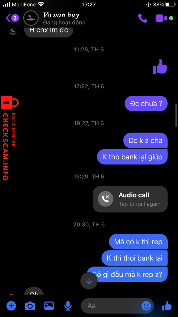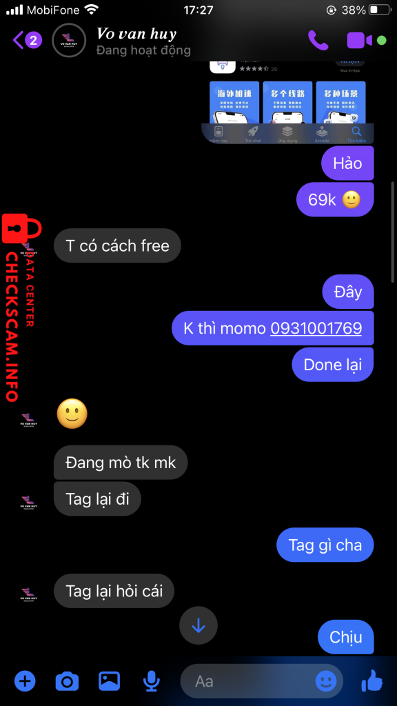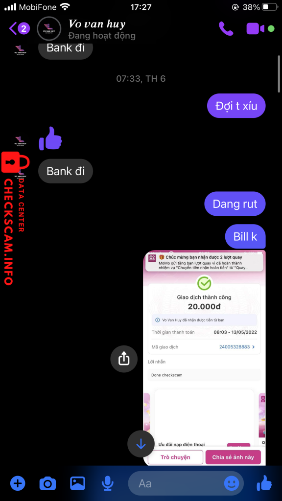 Scammer Alert: Vũ Văn Huy Reported: November 16, 2024 Scammer Information Full Name: Vũ Văn Huy Phone Number: 0327712805 Payment Gate: Momo Payment Account: 0327712805 Category: Marketplace scams Source: Checkscam Evidence Files Report Description Scam 20k lên e nhé Comments Your comment Add Comment No comments yet. Be the first to share your experience with this scammer.