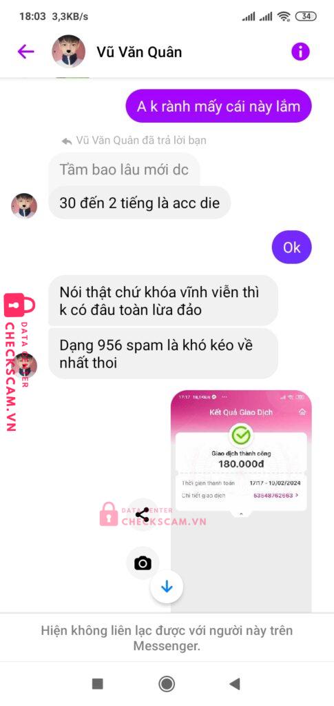 Scammer Alert: Vũ văn quân Reported: November 16, 2024 Scammer Information Full Name: Vũ văn quân Payment Gate: Mbank Payment Account: 00143550678888 Category: Marketplace scams Source: Checkscam Evidence Files Report Description Mình có thuê bạn đó rip fb chuyển tiền xong đc 2 ngày chặn lun Comments Your comment Add Comment No comments yet. Be the first to share your experience with this scammer.