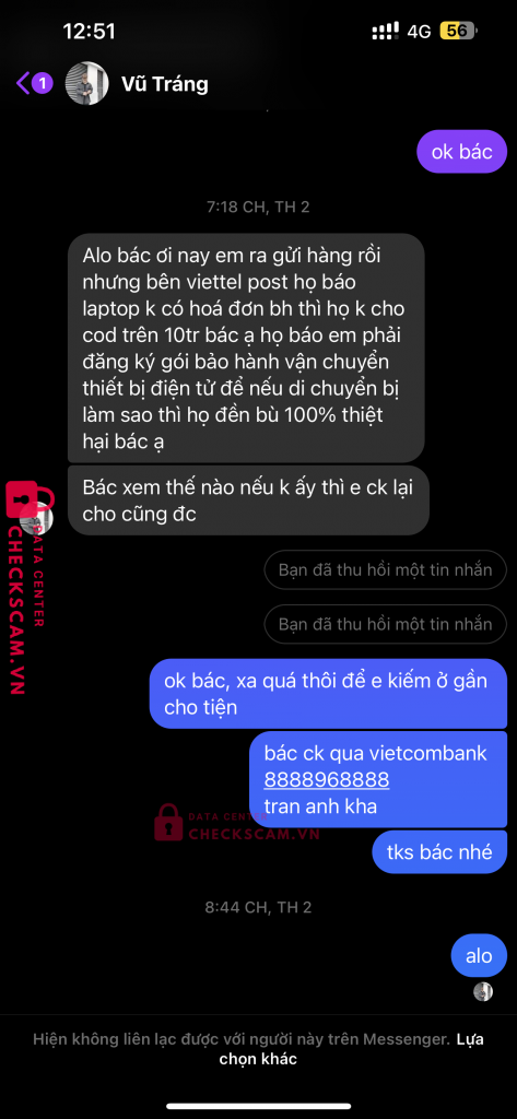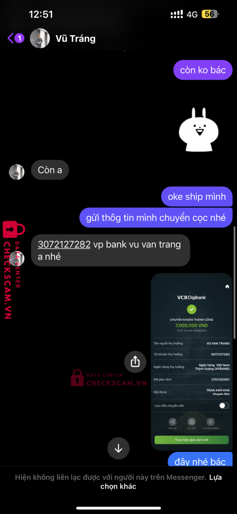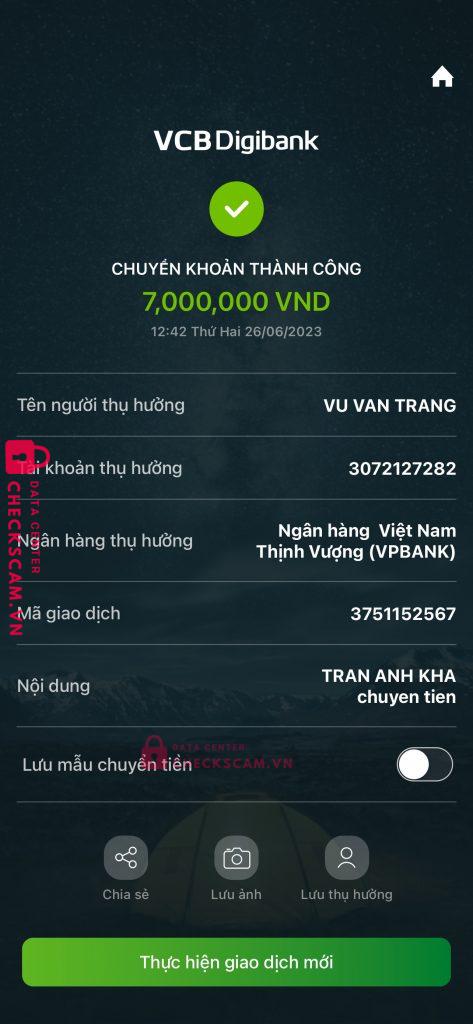 Scammer Alert: Vu Van Trang Reported: November 16, 2024 Scammer Information Full Name: Vu Van Trang Phone Number: 0978845821 Payment Gate: Vp bank Payment Account: 3072127282 Category: Marketplace scams Source: Checkscam Evidence Files Report Description Lừa cọc chuyển tiền Comments Your comment Add Comment No comments yet. Be the first to share your experience with this scammer.