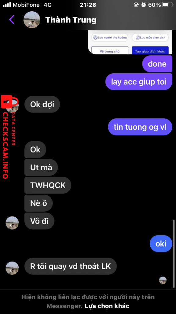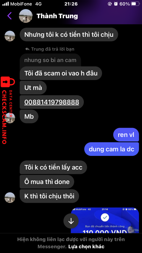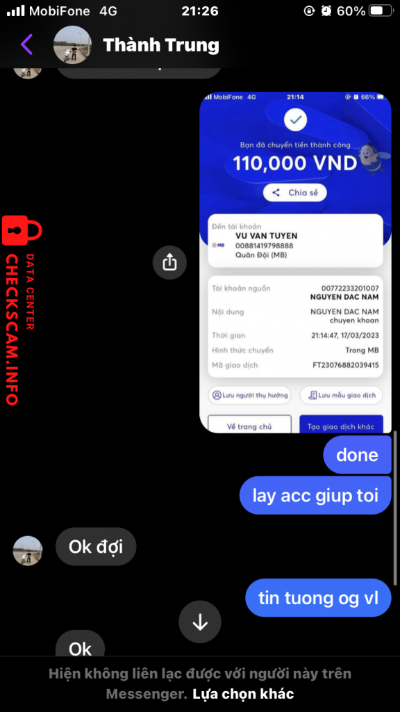 Scammer Alert: VU VAN TUYEN Reported: November 16, 2024 Scammer Information Full Name: VU VAN TUYEN Payment Gate: Mbbank Payment Account: 00881419798888 Category: Marketplace scams Source: Checkscam Evidence Files Report Description nó scam tôi 110k Comments Your comment Add Comment No comments yet. Be the first to share your experience with this scammer.